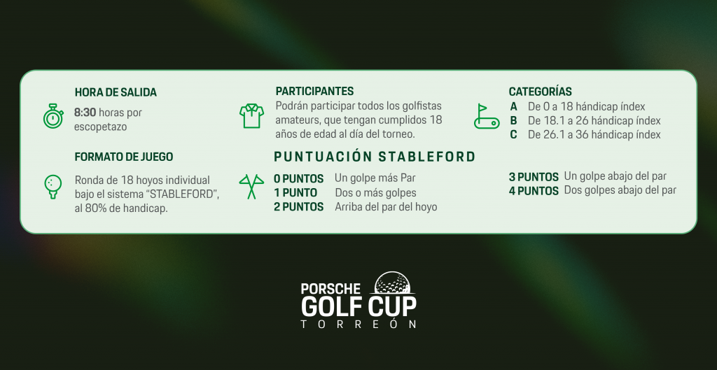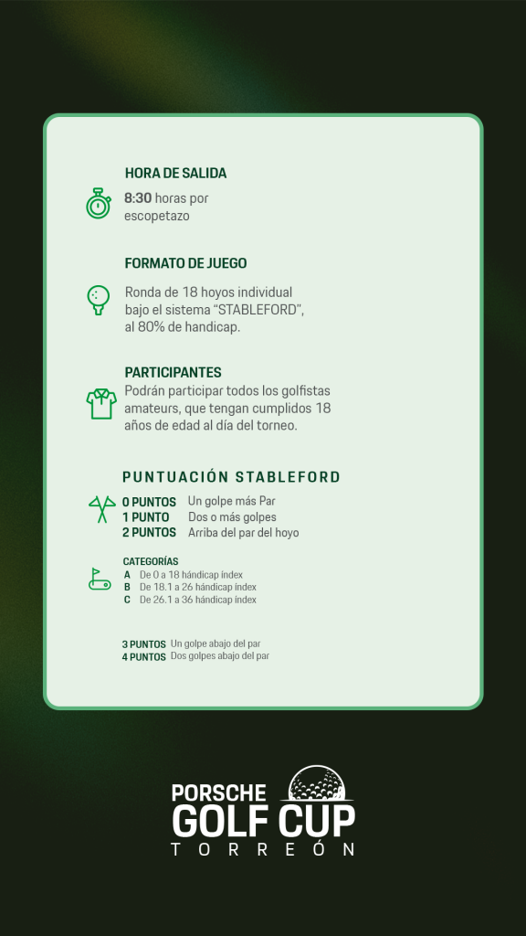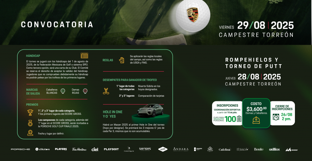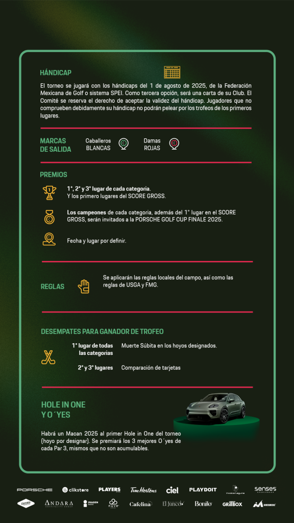 PREMIOS – Trofeo al primero, segundo y tercer lugar de cada categoría y los tres primeros lugares del SCORE GROSS del torneo. Los campeones de cada categoría asistirán como invitados a la PORSCHE GOLF CUP FINALE 2025, en fecha y lugar por definir, además del primero lugar del SCORE GROSS general.